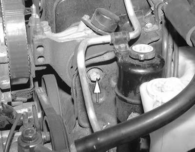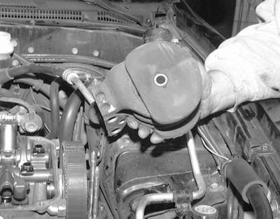 | Fig. 11: Remove the upper engine mount through-bolt .