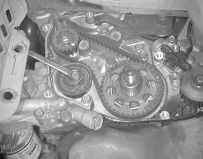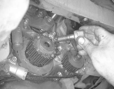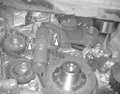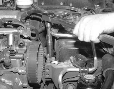 | Fig. 19: Unfasten the two timing belt tensioner retaining