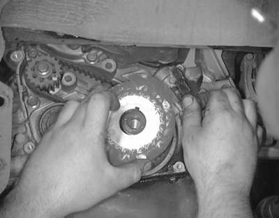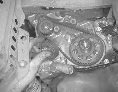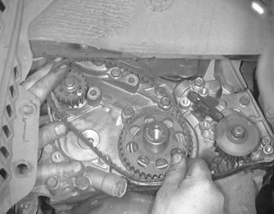| Fig. 18: Remove the timing belt from the engine by lifting