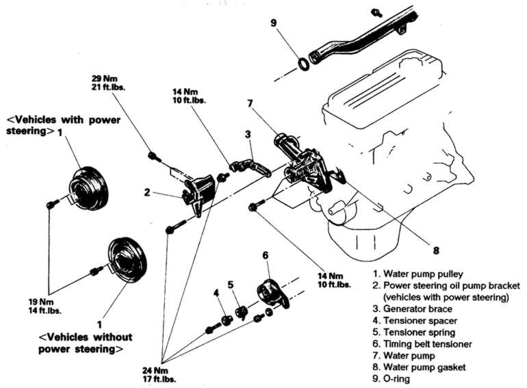 | Fig. 2: Water pump and related components — Mirage with 1.8L (4G93) engines |