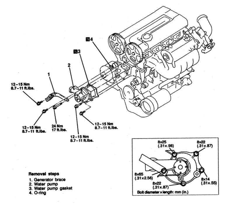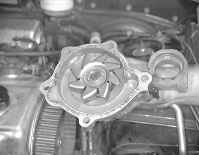 NOTE: The water pump mounting bolts are different in length, note their positioning for reassembly.