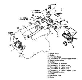 | Fig. 15: Water pump and related components — 3.0L DOHC shown |