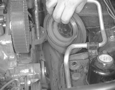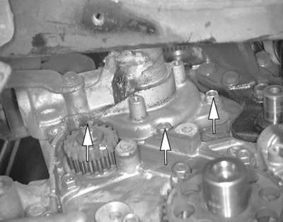 | Fig. 4: Remove the water pump pulley retaining bolts
