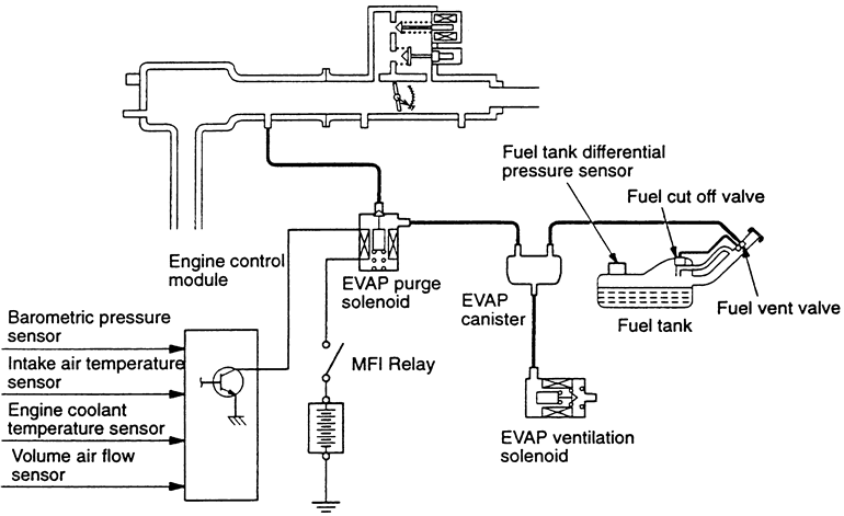 Fuel tank pressure vents fuel vapors into the canister. They are held in the canister until they can be drawn into the intake manifold. The canister purge valve allows the canister to be purged at a pre-determined time and engine operating conditions.
