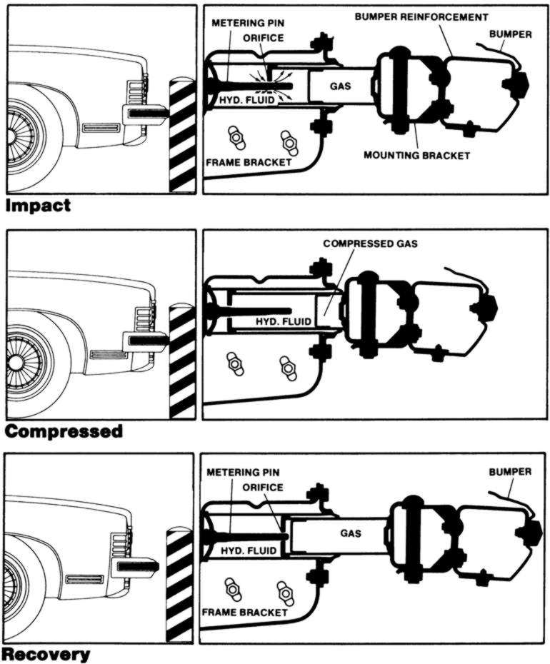 The hydraulic or gas charged bumpers worked as follows: On impact, the bumper makes contact with the barrier. As the bumper is pushed back, hydraulic fluid is pushed past the tapered metering pin, absorbing the impact. As the bumper is stopped, hydraulic fluid in the front chamber has forced the floating piston foreword, compressing the gas to return the bumper. On recovery, compressed gas forces the fluid to return to its original chamber and the bumper is returned to its original position.