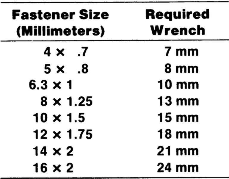 Common metric fasteners and the wrench size required are listed in the following chart.