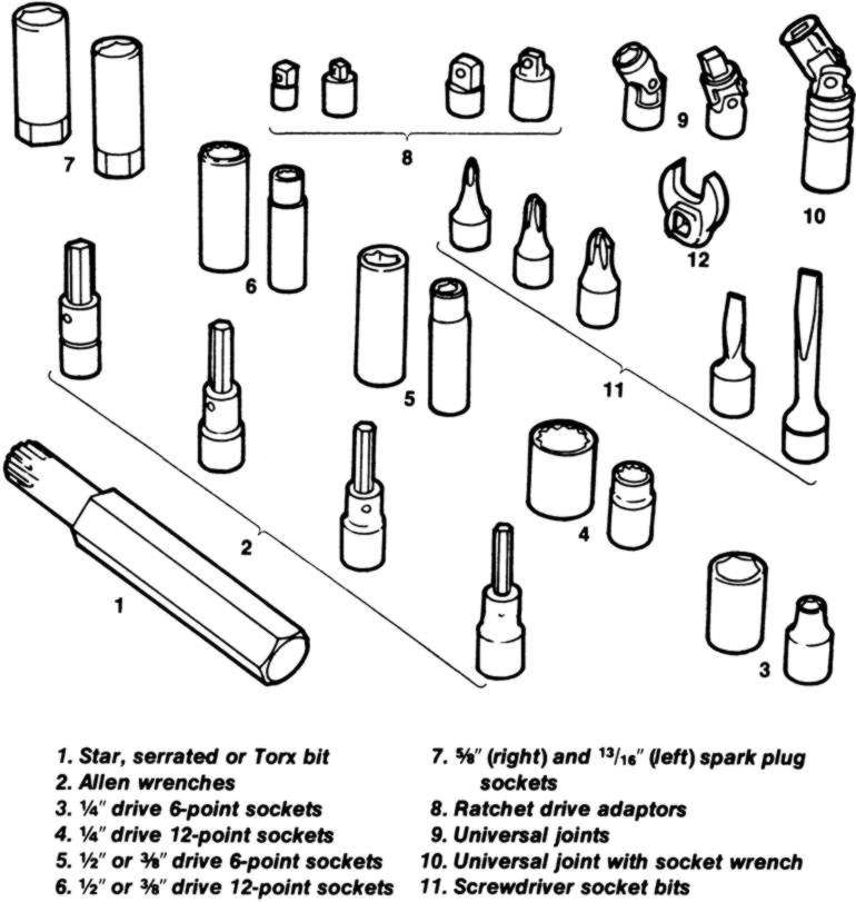 There are plenty of specialty tools for socket sets. Universal joints allow you to get into tight places, but are frequently hard to maneuver. Adapters let you use different size drive sockets on other ratchet handles. Crowfoot wrenches are simply open-end wrench heads that fit a ratchet drive. Speeder handles; super-deep sockets, magnetic inserts, and screwdriver bits are all nice to have, if you have a use for them. If not, don't bother cluttering up your toolbox. Spark plugs require a deep socket, while the standard length is suitable for most of the other jobs you will encounter. The six-point sockets are heavier and give a better grip, but the twelve-point sockets offer more turning positions for working in tight places.