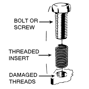Several methods of repairing damaged threads are available. Heli-Coil® (shown here), Keenserts® and Microdot® are among the most widely used. All involve the same principle — drilling out stripped threads, tapping the hole and installing a pre-wound insert — making welding, plugging and oversize fasteners unnecessary.