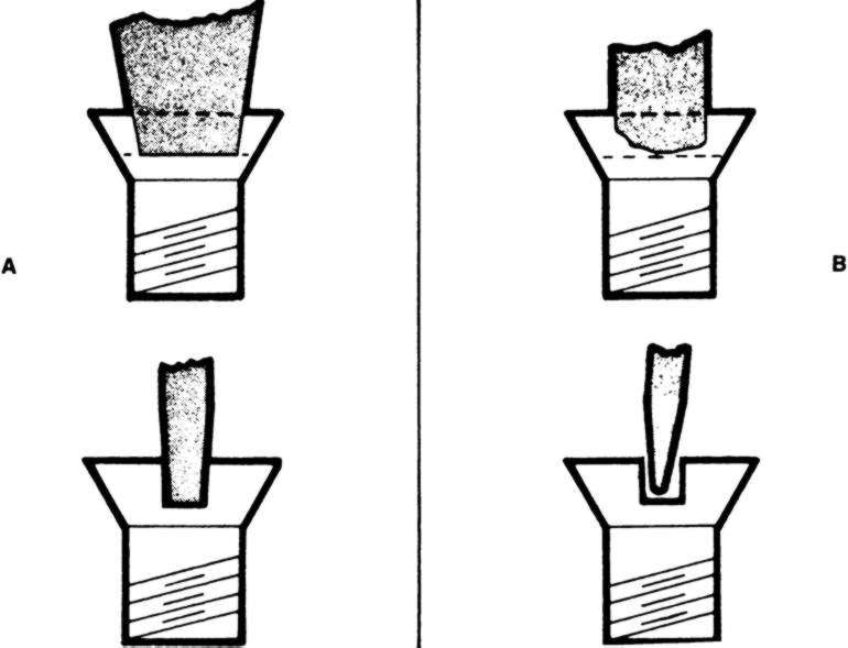 | Fig. 4: Keep your screwdriver tips in good shape. They should fit in the screw slot as shown in "A". If they look like the ones in "B" they need to be ground or replaced. |