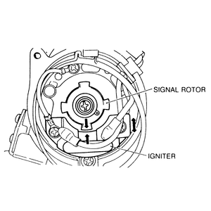- Rotate the engine (you can use a large socket wrench on the bolt that attaches the front pulley — but only turn the engine clockwise) so that one of the prongs of the rotor is directly across from the igniter pickup.