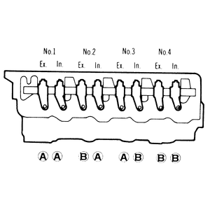 - Loosen the locknuts on the intake and exhaust valves of cylinder No. 1, the intake valve of cylinder No. 2 and the exhaust valve of cylinder No. 3 (labelled A in diagram).