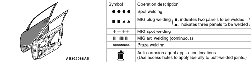 After hemming the front door outer panel, MIG spot weld the flange overlap section at a pitch of 50 mm.
