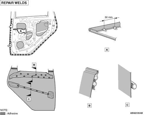 note After hemming the rear door outer panel, MIG spot weld the flange overlap section at a pitch of 50 mm.