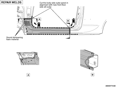 When assembling the front floor side sill outer, apply body sealant in the area shown in the figure of the front pillar. Attach in advance urethane foam to the front pillar as shown in the figure as an alternative to the sound dampening foam material.