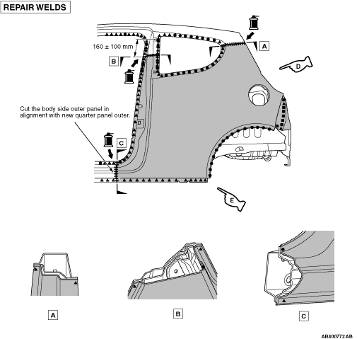 2.When assembling the quarter outer panel, apply in advance body sealant to the areas shown