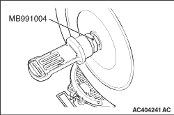note For vehicles with aluminium wheels, attach the camber/caster/kingpin gauge to the driveshaft by using special tool wheel alignment gauge attachment (MB991004). Tighten the special tool to the same torque 236 ± 19 N·m as the driveshaft nut.