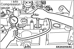 Limit: Maximum 98 kPa 8.If there is a cylinder with compression or a compression difference that is outside the limit, pour a small amount of engine oil through the spark plug hole, and repeat the operations in steps from (5) to (7). (1) If the compression increases after oil is added, the cause of the malfunction is a worn or damaged piston ring and/or cylinder inner surface. (2) If the compression dose not rise after oil is added, the cause is a burnt or defective valve seat, or pressure is leaking from the gasket. 9.Connect the crank angle sensor connector. 10.Install the all of the spark plugs. 11.Use the M.U.T.-III to erase the diagnosis codes.