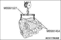 1.Install the chain of special tool engine hanger balancer (MB991454) and special tool hanger (MB991527), and set the chain block.