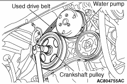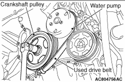 Turning the crankshaft pulley to the anti-clockwise direction (to the left), loop the used drive belt around the water pump body.