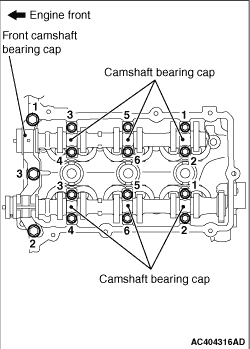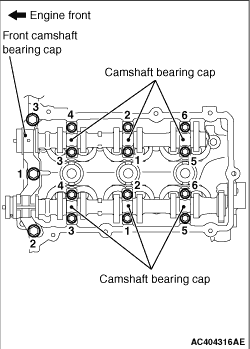 shown, and then tighten the front camshaft bearing cap mounting bolts as well. Tightening torque: