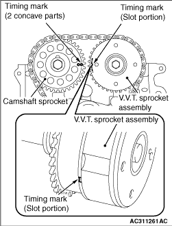 Turn the crankshaft clockwise, and align the timing mark of the camshaft sprocket (2 conceive areas in front of the camshaft sprocket) and that of the V.V.T. sprocket assembly (the groove of V.V.T. sprocket assembly side face). Then set No.1 cylinder to the TDC.