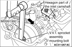 3.While holding the inlet camshaft hexagonal area using a wrench or a similar tool, use special tool torque wrench adapter (MB991992) to loosen the V.V.T. sprocket assembly mounting bolt.