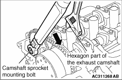 2.While holding the exhaust camshaft hexagonal area with a wrench or a similar tool, loosen the camshaft sprocket mounting bolt.