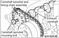 Slightly raise the exhaust camshaft with the camshaft sprocket and timing chain assembly from the cylinder head, remove the camshaft sprocket mounting bolt, and disconnect the camshaft sprocket and timing chain assembly from the exhaust camshaft.