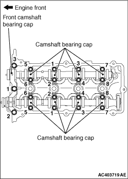 4.Loosen the front camshaft bearing cap mounting bolts, and then loosen each camshaft bearing cap mounting bolts in the order shown. Remove the front camshaft bearing cap and each camshaft bearing cap.