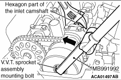 special tool torque wrench adapter (MB991992) to loosen the V.V.T. sprocket assembly mounting