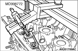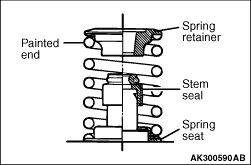 Compress the valve spring using the special tool Valve spring compressor (MD998772), then install the retainer lock.