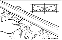 2.Using a straight edge or a thickness gauge, measure the flatness of the cylinder block top surface. Ensure that no gasket or other foreign matter is attached to the top face.