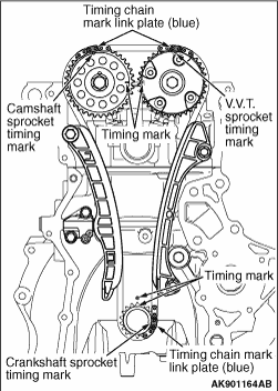 3.Install the chain onto the V.V.T. sprocket, aligning the blue link with the mark on the sprocket.