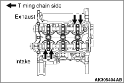 9.Measure the valve clearance at the location shown with an arrow. 10.If the measured value does not conform to the standard value, record the measured value. 11.Replace the valve tappet for the valve whose clearance is out of the standard value.