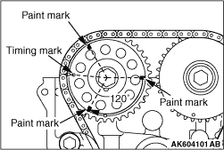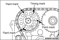 2.Make paint marks on 3 places at the camshaft sprocket exhaust by means of the following