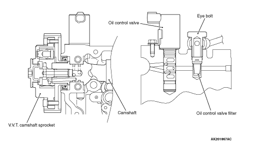 The camshaft, which has the oil passage to transfer the oil pressure from the oil control valve to the V.V.T. sprocket, is designed to be lightweight by using the midair camshaft.