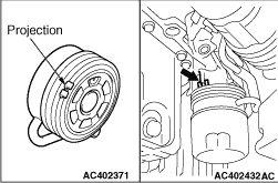 Align the projection on the oil pump case (arrowed part) that prevents the turning of the engine oil cooler with the projection on the engine oil cooler, and install the engine oil cooler.