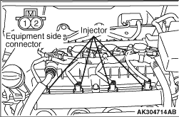 9.Connect the special tool Injector test harness (MB991607) between the injector and battery