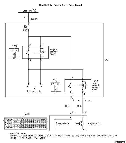4) engine control relay connector and B-221 (terminal No. 1) throttle valve control servo relay connector.