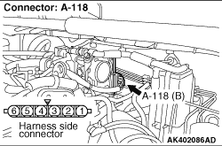 STEP 1. Connector check: A-34 engine-ECU connector and A-118 electronic-controlled throttle valve connector |