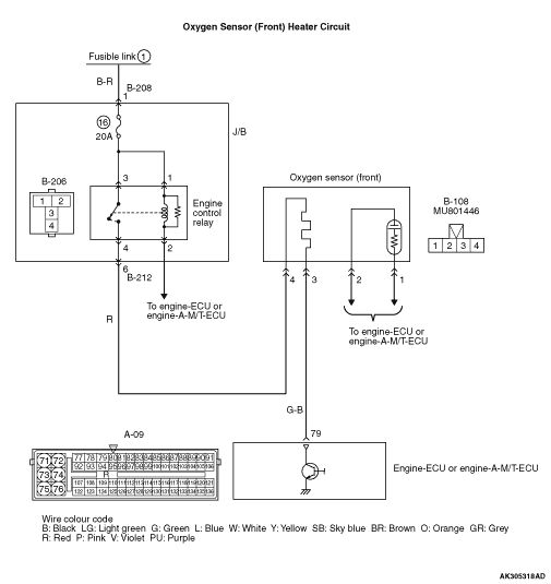 Check intermediate connector B-212, and repair if necessary. If intermediate connector is normal, check and repair harness between B-108 (terminal No. 4) oxygen sensor (front) connector and B-206 (terminal No. 4) engine control relay connector.