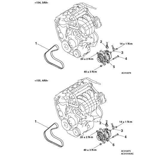 Loosen the bolt indicated by an arrow and move the alternator brace upward. Then lift