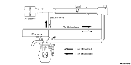When the engine is running at low-load conditions, the inlet manifold vacuum causes the crankcase blowby gas to pass from the cylinder head cover to the PCV valve and the ventilation hose and be drawn into the inlet manifold, thus creating a vacuum in the crankcase. Along with this process, fresh air passes from the air intake hose to the breather hose and the cylinder head cover, and enters the crankcase.