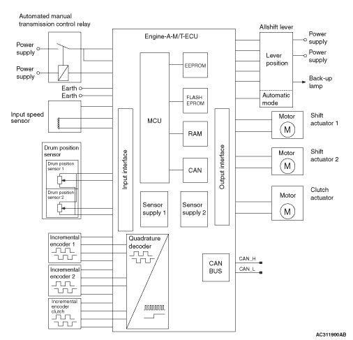 Automated manual transmission management is controlled by engine-A-M/T-ECU.