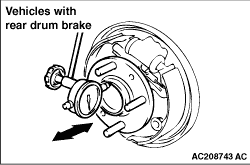 move the hub in the axial direction and check whether or not there is axial play. Limit: 0.05 mm 4.If the play exceeds the limit, replace the rear hub assembly. 5.For vehicles with disc brake, after having checked, install the brake disc, the caliper