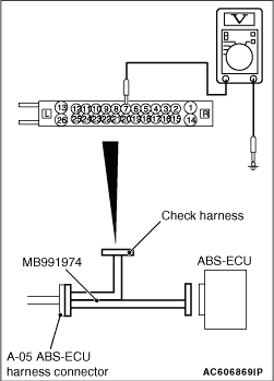 (1)Disconnect the ABS-ECU connector, connect special tool ABS check harness (MB991951) to the harness-side connector, and then measure the voltage at the special tool connector side.