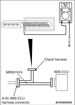 (1)Disconnect the ABS-ECU connector, connect special tool ABS check harness (MB991951)