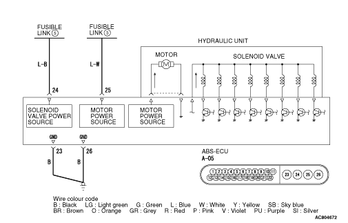 • Carry out diagnosis with particular emphasis on connector(s) or wiring harness in the power supply circuit (terminal No.24) to the ABS-ECU solenoid valve and earth circuit (terminal No.23 and No.26). For diagnosis procedures, refer to How to treat past trouble (GROUP 00 - How to Cope with Intermittent Malfunction ).