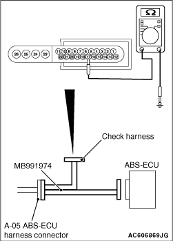 (1)Disconnect the ABS-ECU connector, connect special tool ABS check harness (MB991951) to
