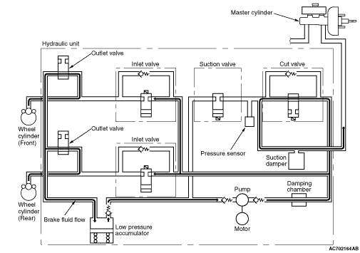 When the system increases the fluid pressure automatically, it closes the cut valve to shut off the pressure line to the suction valve, and drives the pump motor. For example, when the vehicle runs in the understeer direction while turning to the right, TCL/ASC-ECU supplies the brake fluid from the pump to the rear right wheel to apply the braking force on it.